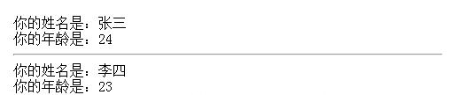return "你的姓名是:"+name+"<br/>"+"你的年龄是:"+age;