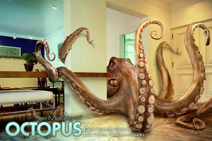 在草图的基础上,我们在合成章鱼到场景里时制作了很多的效果。厨房的几何型进过了再创建,在典型的厨房尺寸的基础上。为了创建触角,我们给每一个触角创建了骨骼系统,并用手动安置。为了制作吸盘,我们制作了若干的模型,因此我们能够得到更多的细节,并能加快制作的速度。纹理和灯光