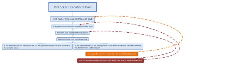 VirLocker的多变能力使得每个人都头疼, 研究员、受害者和安全公司等等。 每次VirLocker 把自身添加到一个文件, 实际上该文件在许多方面都不同于它自身的其他版本。 VirLocker 可以添加“伪代码”到它自身的某些部分从而使得文件不同, 它可以在恶意软件的主要加载器中使用不同的API以避免 部分指纹识别,它可以使用不同的 XOR 和 ROL 种子使得可执行文件的加密内容完全不同等等。多态功能的这种级别使得它非常难以处理。即使当每个文件中的解压存根不同时,它通常被用来识别每个变种,它只留下行为和启发作为一种可行的检测方法。
