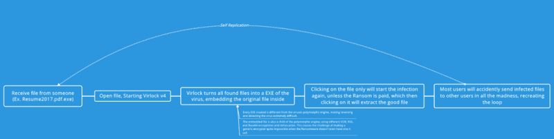 VirLocker 能够像其他恶意软件一样从它的作者那里传播开来, 但是VirLocker在感染其他用户时做了优化。 因为每一份被VirLocker感染的文件都变成了它自身,许多用户会不小心地把一份受感染的文件发送给朋友和同事,所以备份也被感染了,甚至应用程序和可执行文件都会不安全。 基本上, 被VirLocker感染后, 你不可以信任受影响计算机上的任一单个文件。当尝试去清理计算机时就遇到一个难题,因为没有什么可以信任并且每个你使用的工具都被感染了。甚至当你尝试去下载一个工具来帮你都成了问题,因为如果 VirLocker 运行在计算机上的话, 它会试图去感染新的文件即使在那个文件被打开之前。然而,如果你发现自己的计算机被这个变体感染了,千万不要尝试去移除它!本文不仅讨论敲诈者病毒是如何运行的, 还会向你展示如何在不支付赎金的情况下取回你的文件。