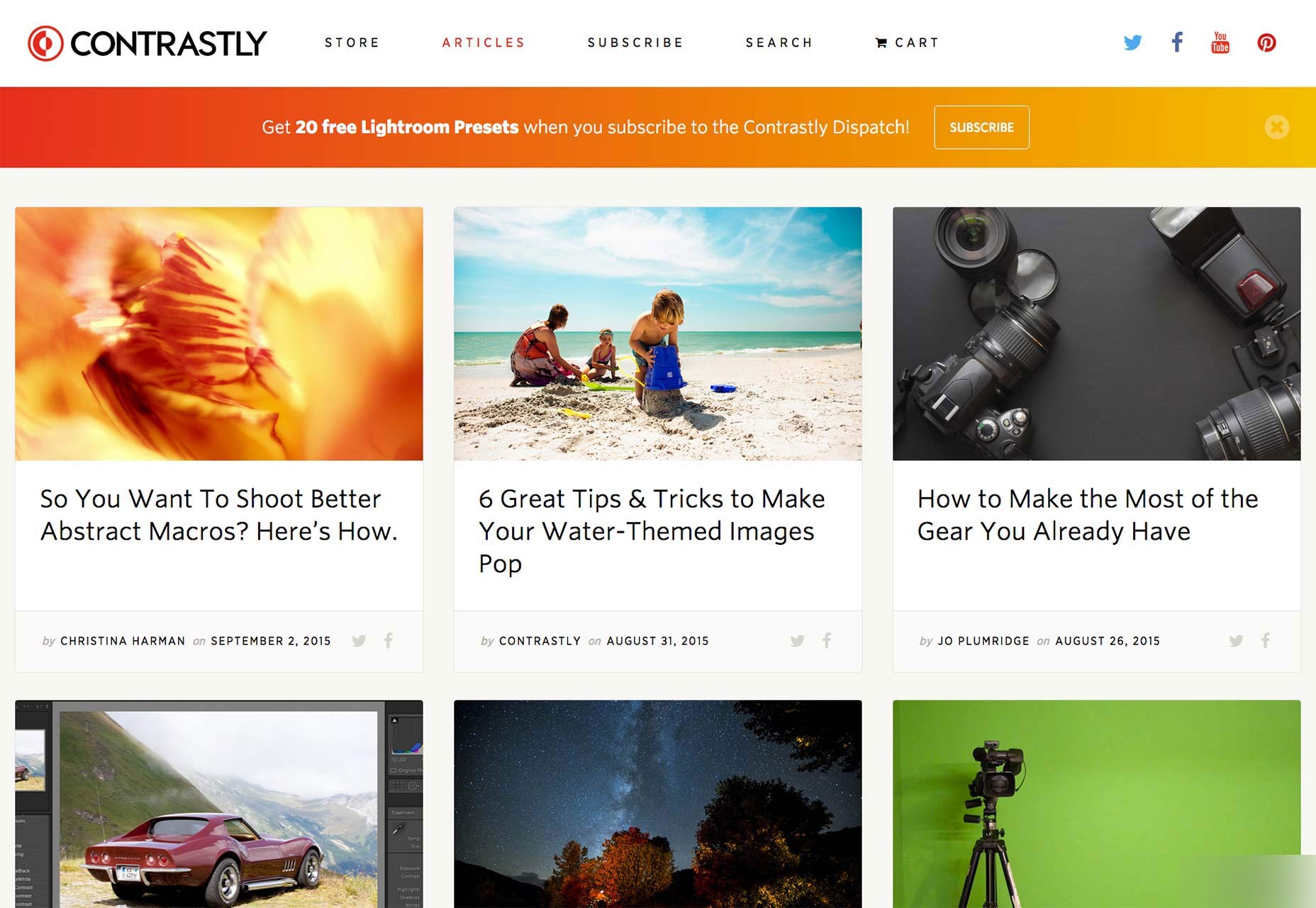 拿摄影杂志Contrastly举个例子。如果你顺着栅格来浏览卡片会让你意识到这种信息架构的重要性。和许多网站一样,最新的文章在上面,旧的文章在下面。新的文章通常更重要,而文章下方的相关链接是同样重要的文章。这样的浏览方式确保了信息的条理,也让用户阅读更顺畅,黏度也更高。
