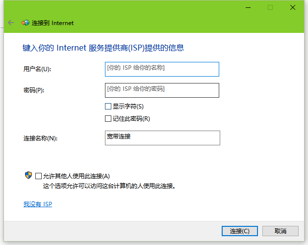 6、输入运营商提供的上网用户名和密码,点击连接即可,勾选“记住此密码”,下次连接时就不用再输入密码了。