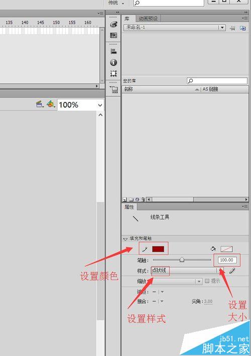 3、选中“线条工具后”,鼠标就变成了十字形状,然后在“属性”面板里分别调节线条的颜色,线条的大小,线条的样式,将颜色设置为红色,线条的宽度设置成100,将线条的样式设置为点状线,如图所示: