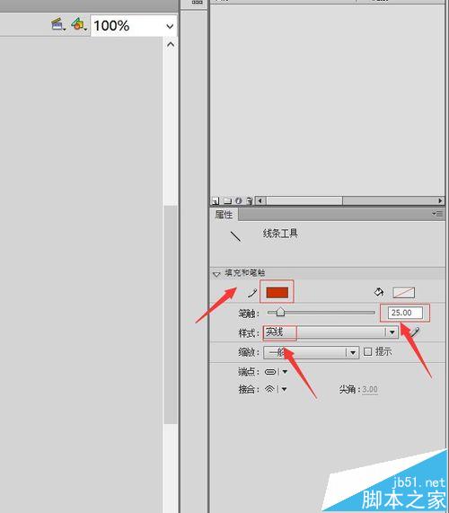 5、再次来到“属性”面板,然后在“属性”面板里分别调节线条的颜色,线条的大小,线条的样式,将颜色设置为竹签颜色,线条的宽度设置成25,将线条的样式设置为实线,如图所示: