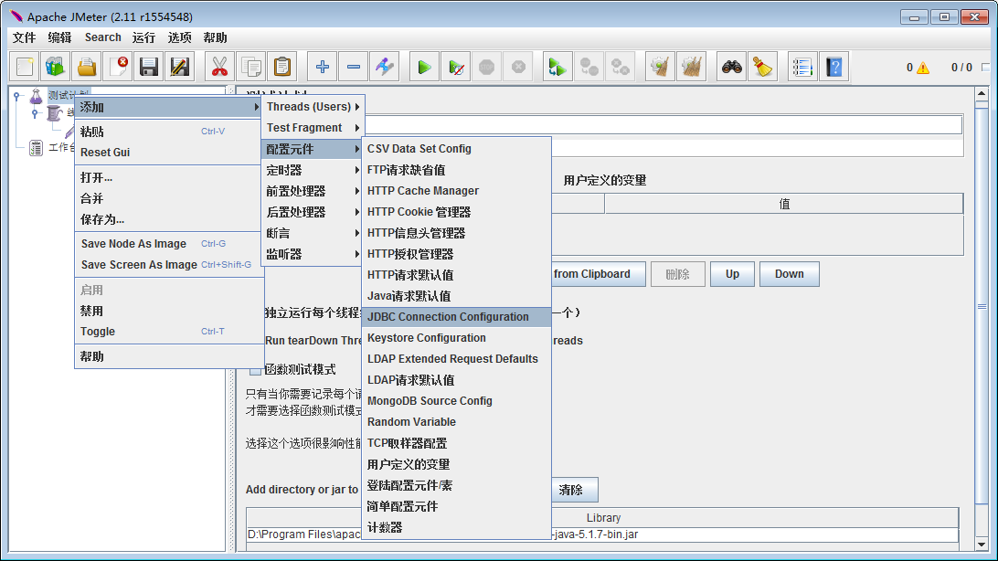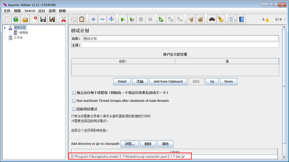 3、启动Jmeter,在测试计划点击浏览添加刚刚拷贝的jar包