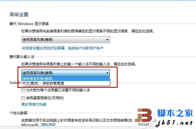 5、在弹出界面选择“替代默认输入法”下面的“使用语言列表(推荐)”选项,此时会列出用户当前安装输入法,选择之后即可更改默认输入法。