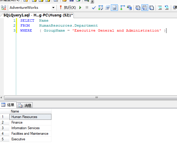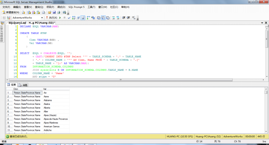 当你知道这个函数可以进行扭转之后,你也应该知道它可以运行多条SQL命令。并且使用分号来区分独立的操作。下面语句是在Person架构下,有名字为Name的列的值: