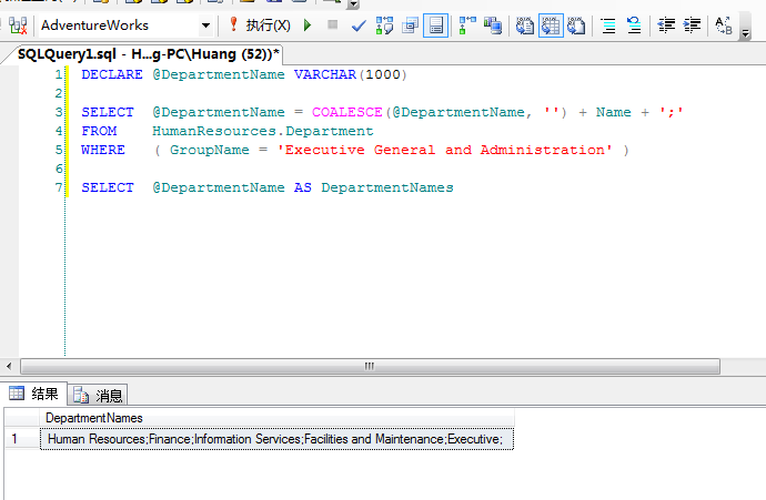 DECLARE @DepartmentName VARCHAR(1000) SELECT @DepartmentName = COALESCE(@DepartmentName, '') + Name + ';' FROM HumanResources.Department WHERE ( GroupName= 'Executive Generaland Administration' ) SELECT @DepartmentName AS DepartmentNames