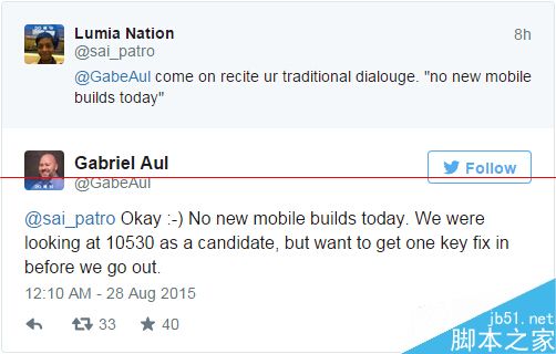 其实在昨天的时候,Gabriel Aul早就透露过自己早已正在使用Windows 10 Mobile build 10532的事实。但是在今天的Twitter上,他带来了一个“坏消息”。