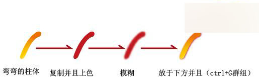 首先,我们先用钢笔工具勾出自己心中麦子的样子``因为我是想表现一幅可爱``活泼的金秋的感觉``所以我的麦子画的是弯弯的圆柱体~!并且使用了主题所需要的渐变填充•“黄-橘黄”然后复制了一层放在它的下面并且填充了褐色(参考值C=25 M=25 Y=100 K=0)同样也使用了模糊。