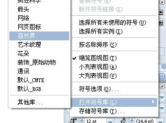 我们找到符号面板后点击右上方的小三角就会出现下拉菜单,选择“开打符号库/自然界”