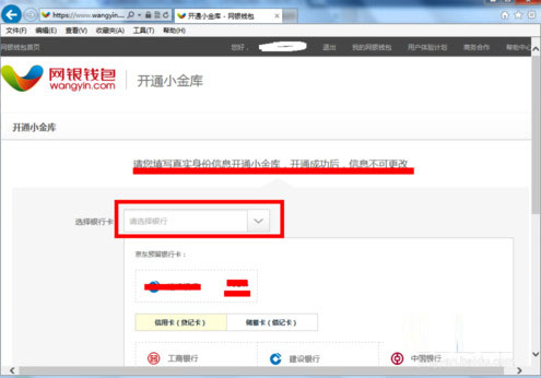 页面跳转到网银钱包页面,需要输入你的银行卡信息!选择你的银行卡,如果你在京东预留过银行卡信息,直接选择预留的银行卡也可以!