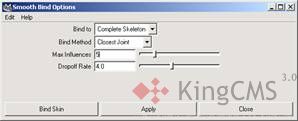 ● Bind Method :选择 Closest Point 单选按钮,系统自动为每个关节创建一个 Jointclusters ,并把每个关节附近的点分配到相应的关节簇中,从而使关节簇可以控制皮肤点组。