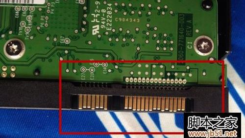 6、SATA接口的金手指:如果是全新硬盘,基本上看不见插痕,如果使用过就能看到插痕了,有的插痕非常明显,呈黑色。