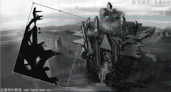 根据之前的想法,用【变形工具】把图调整成了“两点透视”,因为前景透视角度比较大,选择了把前景单独调整,调整透视之后,发现主体建筑太靠近下面了,又用【裁剪工具】进行了裁剪,在图的左边和下边补了一块,让图变大了一些,调整情况下图4-3,4-4所示。