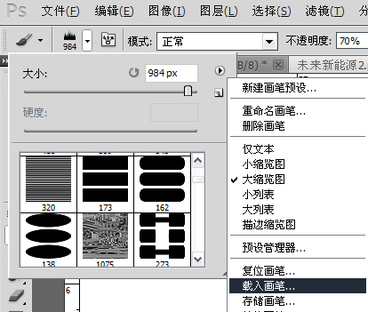 笔刷可以在网上下载,下载完后,双击画笔就可以自动载入;也可以选择手动载入:先选择【画笔工具】,然后在工具箱上方【画笔工具】的“属性条”里面,点击“倒三角形”,在弹出的面板右上角,点击“小三角形”,在弹出的菜单里面,选择【载入画笔】(如下图6-3)。