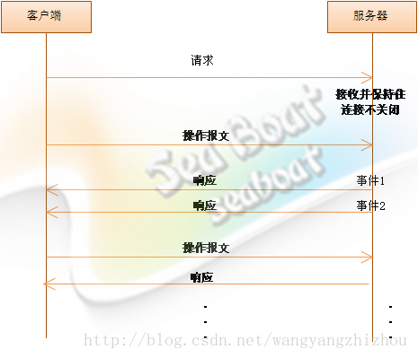 如图所示,客户端发送一个请求到服务器,服务器接收了连接后一直保持住连接不关闭;接着客户端发送一个操作报文告诉服务器需要做什么操作,服务器处理完事件1后会给客户端响应,然后处理完事件2后又会给客户端响应;然后客户端继续发送操作报文给服务器,服务器再进行响应。