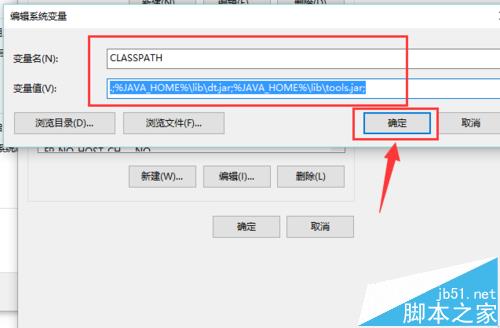6、在系统变量区域,选择“新建”,输入变量名“CLASSPATH”;变量值:“.;%JAVA_HOME%\lib\dt.jar;%JAVA_HOME%\lib\tools.jar;”。请注意变量值中,前面的“点“和”分号”,可以直接复制此变量值。然后点击“确定”。