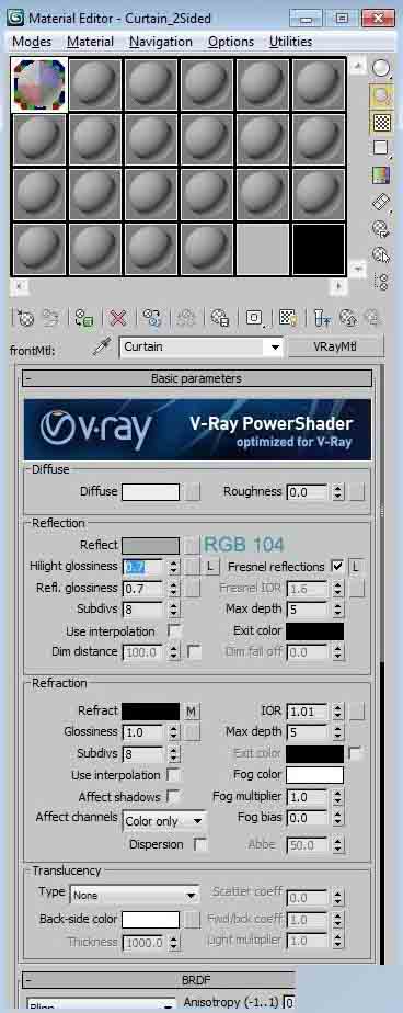 窗帘材质是用Vray2Sided材质来模拟半透明的外光,以及光线是怎样散射到窗帘上面的。微量反射设置不可用,因为不需要扩大光线反射。在折射槽真能搞有一个渐变贴图,这让窗帘看上去不那么透明但是在前面却更加的透明。