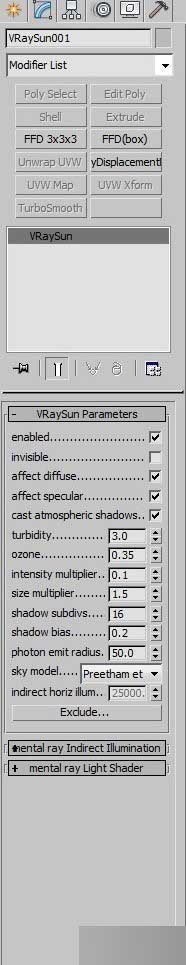 在一天的这个时候,阳光从一个很广的角度照向我们,产生了一个很柔和的灯光效果和一个很长的阴影。笔者使用了VraySun,并调整了振幅(Z坐标),将尺寸适度的扩大来创建一个更加柔和的阴影。这里是天窗的位图贴图。(图19-21)