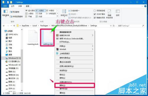 在打开的Settings(设置)窗口,找到 settings.dat(设置) 文件夹,并右键点击settings.dat文件夹,在右键菜单中点击:删除,删除以后退出资源管理器;