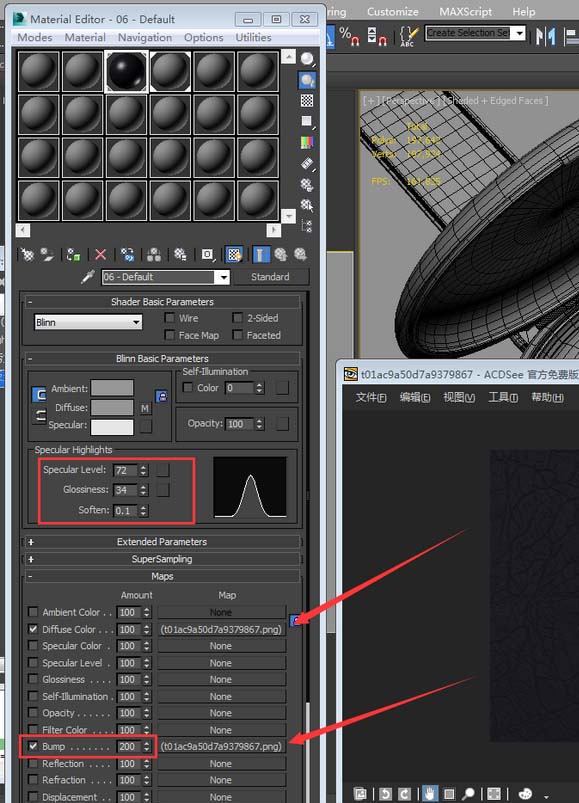 皮质材质:将选好的皮革贴图贴到标准材质球的Diffuse通道和Bump通道,Bump通道值设为200,这样让表带凹凸的效果比较明显;设置表带高光:Specular Level: 72;Glossiness:34。如图: