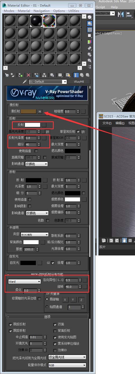 从材质库中选择vray 的标准材质球VrayMtl,漫反射通道贴上一张银色拉丝金贴图,反射颜色设置为:255,255,255白色;反射光泽度设置为0.8;反射细分设置为40;各向异性(-1..-1)设置为0.5;旋转设置为40;勾选跟踪反射,折射;如图: