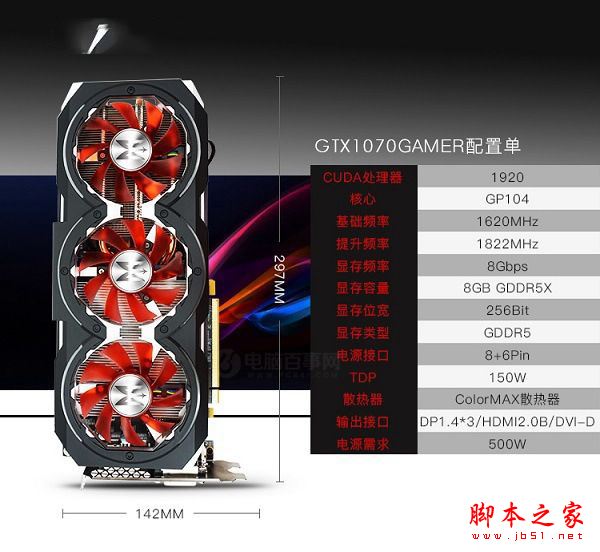 影驰GTX 1070 GAMER显卡,属于非公版显卡,采用三散热设计,散热不输公版,并且价格相比公版要便宜超过400元,性价比更高。影驰GTX 1070 GAMER显卡定位高端游戏玩家,配备1620(1822)MHz/8GHz高主频,8G GDR55超大显存、256Bit大位宽,性能强劲,足以极致畅玩时下各类大型游戏。