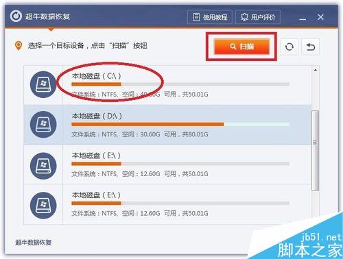 2、根据文件丢失的位置,选择一个指定硬盘分区进行扫描(比如你的回收站是放在C盘的,那么就选择C盘进行扫描)选中后,点击“扫描”