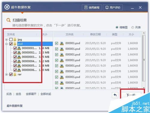 3、你可以选择扫描指定的文件格式。扫描之后会将能够恢复的文件罗列出来。点击“下一步”