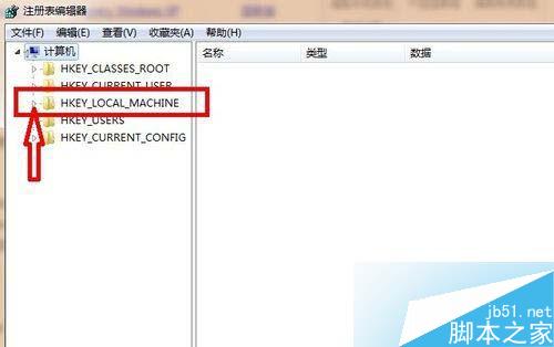 4、进入注册表,找到“HKEY_LOCAL_MACHINE”,请依据下图指示,点击红色框内,箭头所示的文件夹前的三角按钮