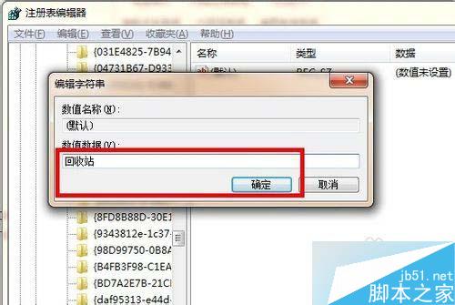 10、点击修改后,出现如下界面,请在数值名称一项中,将“{默认}”修改为“{回收站}”点击确定