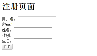 <body > <h1>注册页面</h1> <form action="zhucechuli.php" method="post"> <div>用户名:<input type="text" name="uid"/> </div> <div>密码:<input type="text" name="pwd"/> </div> <div>姓名:<input type="text" name="name"/> </div> <div>性别:<input type="text" name="sex"> </div> <div>生日:<input type="text" name="birthday"> </div> <input type="submit" value="注册"/> </form> </body>