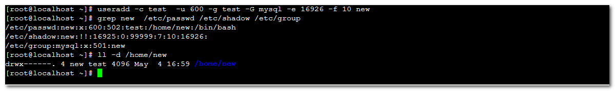 [root@localhost ~]# useradd test [root@localhost ~]# grep test /etc/passwd /etc/shadow /etc/group /etc/passwd:test:x:501:502::/home/test:/bin/bash /etc/shadow:test:!!:16925:0:99999:7::: /etc/group:test:x:502: [root@localhost ~]# ll -d /home/test drwx------. 4 test test 4096 May 4 16:25 /home/test