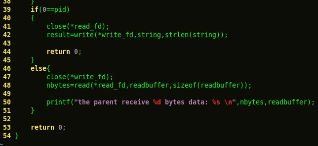 返回值:成功,返回0,否则返回-1。参数数组包含pipe使用的两个文件的描述符。fd[0]:读管道,fd[1]:写管道。