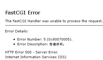 以上就是糟糕蓝天最近收集整理的关于FastCGI Error Number: 5 (0x80070005)解决方法的全部内容,更多相关FastCGI内容请搜索靠谱客的其他文章。