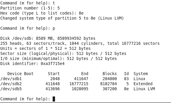 修改分区类型:t修改分区类型,修改sdb5的,8e代表lvm逻辑卷,L可以查看分区类型,自己可以随意选。
