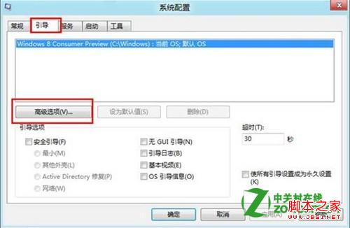 2、在弹出的系统配置对话框,点击“引导”选项卡,再点击“高级选项”。如下图所示: