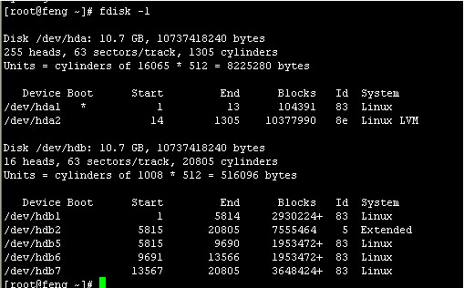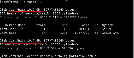 再次使用fdisk -l命令就可以查看到磁盘hdb已经分区成功。