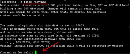 输入 fdisk /dev/hdb 然后回车,给硬盘进行分区。如下图