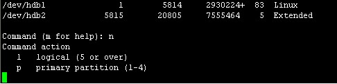 此处就开始划分扩展分区hdb2下的逻辑分区吧!接着上图,输入命令n回车