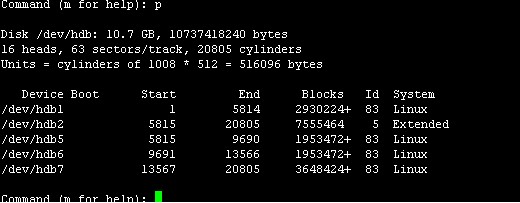 linux分区不同于windows,linux下硬盘设备名为(IDE硬盘为hdx(x为从a—d)因为IDE硬盘最多四个,SCSI,SATA,USB硬盘为sdx(x为a—z)),硬盘主分区最多为4个,不用说大家也知道…..所以主分区从sdb1开始到sdb4,逻辑分区从sdb5开始,(逻辑分区永远从sdb5开始…)设备名可以使用fdisk –l查看
