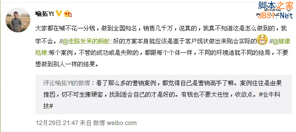 在昨天晚上,看到微博里知名自媒体人喻拓Yt发表了一条微博:看了那么多的营销案例,都觉得自己是营销高手了嘛。案例往往是由果推因,切不可生搬硬套,找到适合自己的才是好的。有钱也不要太任性,收敛点。微博发出后引起了大家的评论,后来喻拓Yt又评论转发了一句:大家都在喊不花一分钱,做到全国知名,销售几千万,说真的,我真不知道这是怎么做到的,我学不会。