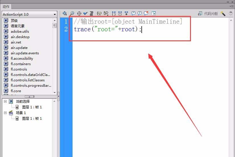 1、主时间轴与舞台类似,也是容器的容器。即变量root保存的是复杂数据,主时间轴也是由类创建的。