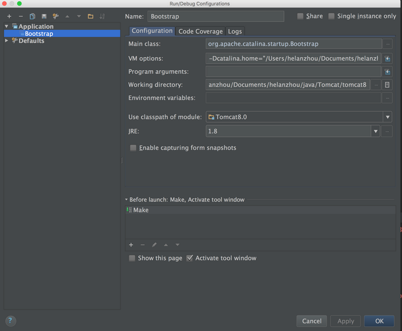 在VM options:中填入,你刚刚设置catalina-home路径,我的是:-Dcatalina.home="/Users/helanzhou/Documents/helanzhou/java/Tomcat/tomcat8/catalina-home"Working directory是默认的,不用管