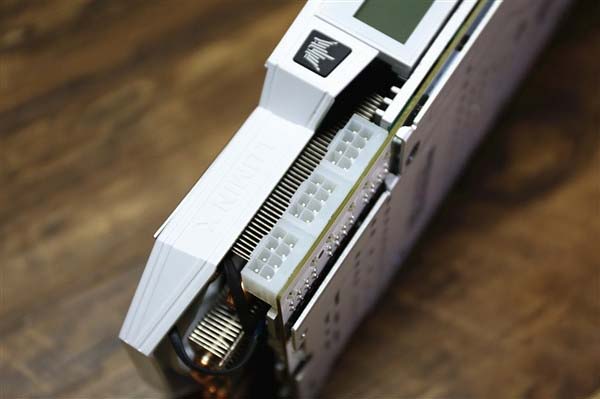 正面皇冠造型和中间风扇弧形均可实现1680万色自定义呼吸,同时增加了外接供电口和输出接口的RGB灯光设计,支撑杆连接显卡更可实现色彩同步。