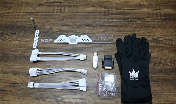 影驰GTX 1080Ti 名人堂限量版采用了全新的双开门包装设计,并增加了多样配件,包含RGB显卡支撑架、DVI转HDMI接头、纯白供电转接线、8GB3.0高速U盘、防静电手套。