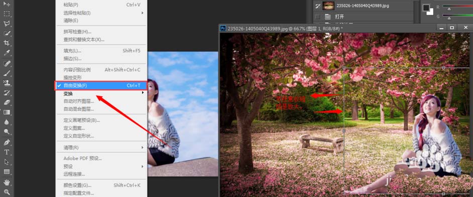 7、如果嫌图片太大或是太小,我们还可以通过自由变换任意收缩或者是放大人物图片哦。点击【编辑】→【自由变换】,或者直接按快捷键Ctrl+T,对人物图片进行相应的调整,调整到合适大小后双击鼠标完成变换。