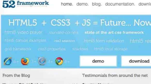 52Framework是一个结合了HTML5、CSS3和JavaScript的强大的前端框架。该框架提供了一些封装好的内置工具,包括HTML5视频播放器、HTML5表单验证器,CSS3属性工具、栅格系统和HTML5画布示例等。