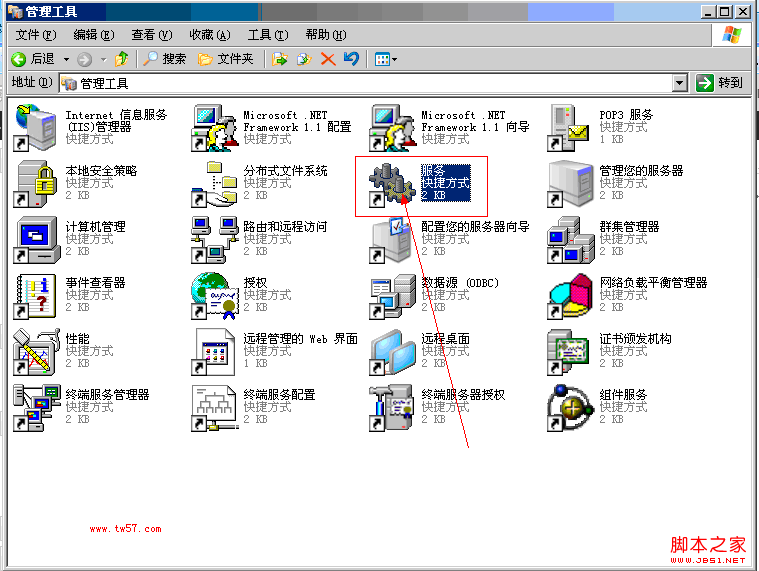 打开控制面板中的管理工具之后,这里有很多一些程序的快捷方式,找到服务并双击即可打开Windows的服务管理。